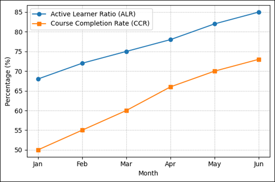 Figure 5 Automated Content and Assessment Lifecycle Workflow 7. Performance Assessment and Risk Analysis Quality assurance of any online art education platform will rely on performance evaluation and risk evaluation. In addition to the testing at a system level, platforms have to assess creative engagement, pedagogical outputs, and economic sustainability. The fact that it includes data visualization using performance graphs makes it easier to interpret and makes it possible to make data-based managerial decisions. As shown in the following (4-6) figures, critical dimensions learner engagement, financial sustainability, and system reliability are vital to show how quantitative analysis contributes to the addition of continuous improvement. Figure 6, indicates that there is a strong positive correlation between Active Learner Ratio (ALR) and Course Completion Rate (CCR), which demonstrates the significance of the engagement-focused design. The higher the number of individuals engaged, the higher the completion rates are as 68% of those engaged translate to 50% completion rates and above 85% engagement translates to above 70% completion rates. The discussion indicates that interactive modules, peer critique system and creative assignments have a strong impact on increasing learner persistence. This data can be utilized by the administrators to adjust content pace, the duration of modules, and the frequency of feedbacks. Figure 6