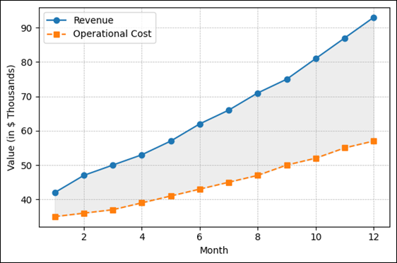 Figure 6 User Engagement vs Course Completion Rate Figure 7, which brings out financial performance trend in twelve months, compares the revenue and operating costs. The expanding area is illustration of profit growth, wherein the revenues would exceed the costs by a margin of about 20 to 25 percent at the point of cycle termination. This implies that they have good monetization strategies, consistent subscription renewal, and effective deployment of resources. The trend validates that the hybrid revenue models (subscriptions and royalty systems) can increase economic strength and scalability, especially with the complements of automated resource planning and content pricing that vary dynamically. Figure 7