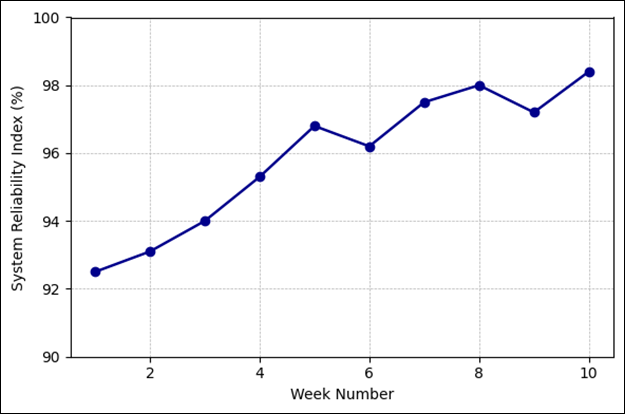Figure 7 Revenue Growth vs Operational Cost Figure 8 shows the System Reliability Index (SRI) using uptime, latency and error-rate measurements. It is apparent that automated monitoring, redundancy protocols, and regularly planned maintenance enhance reliability in the long-term as the trend of 92% to 98% over ten weeks is always on the increase. A decrease under the 95% threshold can be considered an incident diagnostics or performance scaling trigger. This quantitative monitoring system is in compliance with the ISO/IEC 27001 requirements on operational resiliency and assists in the long-term compliance with governance. Figure 8