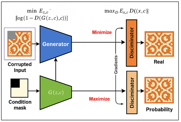 1. INTRODUCTION Patterns are an essential element of a broad spectrum of visual, cultural, and industrial instances, such as folk art and textile weaving, architectural tiling, digital graphics and automation in modern design. Their architectural repetitions, geometric patterns and textual nuances do not only have aesthetic meaning, but also contain cultural, functional, and symbolic meaning. But in practice, in most situations patterns are incomplete, degraded, obscured or distorted by some physical damage, imaging artifact, or constraints in data collection. High fidelity reconstruction of these patterns is thus needed in digital restoration, content creation, automated production processes and computer vision systems that demand high-quality feature recovery. The conventional ways of pattern reconstruction are very much dependent on deterministic algorithms, namely, patch-based synthesis, interpolation and morphological filtering, which works quite well in simple textures, but fail in the more complex pattern Wang et al. (2023). These classical methods come into their own especially when it comes to multi-scale forms, non-repetitive patterns, complex color transfers and stochastic textures. They also are not semantically understanding, and frequently give blurry or repetitive results that are not in line with the global pattern logic. The implementation of deep learning has seen significant progress made by convolutional architectures which learn hierarchical features directly on the data. However, even with their representational ability, the traditional models of autoencoders are more inclined to smooth the results and are unable to reproduce the high-frequency detail without specific priors Li et al. (2022). The paradigm of pattern reconstruction provided by Generative Adversarial Networks (GANs) implies its ability to learn the distribution of patterns and produce visually coherent, realistic and structurally correct reconstructions. GANs that were proposed by Goodfellow and colleagues consist of two neural networks (a generator and discriminator) that are trained through a competitive, game-theoretic model Niu et al. (2021). The generator tries to produce convincing pattern reconstructions and the discriminator will analyze whether they are authentic patterns. The generator can learn to generate such outputs that are not only as accurate as possible with regard to reconstruction losses but also it can approximate the natural statistics of the target pattern space. The benefit of GANs is that they are able to reproduce the delicate structural information and textural details not preserved by pure reconstruction losses Chakraborty et al. (2024). This especially qualifies them in usage in cases of damaged cultural objects, deteriorated paintings, repair of textile patters, mosaic restoration and improvement of digital designs. GANs, in this case, are able to fill in missing parts, sharpen edges, reproduce symmetrical patterns and regenerate stylistic textures with high levels of perception. In addition, the GAN architectures, including but not limited to conditional GANs, multi-scale GANs, attention-guided GANs, and hybrid GAN-transformer models, are flexible enough to be adapted to the specifics and variety of types of patterns Ivanenko et al. (2023). More recent developments have shown that perceptual loss, style loss, and multi-level feature matching can be combined to a great effect in enhancing reconstruction realism. These improvements allow the network to follow global pattern coherence, and fine-tuning of finer-scaled structural details, to overcome numerous of the weaknesses of previous generative models. 2. Background work Pattern reconstruction Studies in the early days of classical computer vision and image processing introduced algorithms that aimed to make use of the local pixel statistics, repetitive pattern, or mathematical transforms. Patch-based texture synthesis models, including non-parametric sampling and exemplar-based inpainting, were also one of the earliest techniques that would allow reconstructing the lost regions by copying similar-looking patches to the known ones. Although useful in the case of simple and repetitive textures, these methods tended to fail when dealing with irregular motives, multi-scale patterns, and semantically significant patterns Wanta et al. (2022). Equally, interpolation-based algorithms and diffusion-driven algorithms generated smoother transitions however they did not restore high-frequency information or structure boundary needed to reconstruct authentic patterns. As the deep learning grew, autoencoders and convolutional neural networks (CNNs) brought about a lot of improvements since they learnt hierarchical features representation Ke et al. (2022). The methods of CNN-based inpainting, which included context encoders and encoder-decoder models with skip connections made it possible to reconstruct structural elements more successfully. However these models usually generated either blurry or over-averaged results because they used pixel-wise losses such as L1 and L2, which are poor predictors of perceptual realism. Also, they had no controls that they could use to make reconstructed textures be in agreement with the natural statistics of the target domain. The concept of adversarial training made Generative Adversarial Networks (GANs) a paradigm shift since a model is capable of producing outputs that are highly similar to natural distributions of patterns Fu et al. (2022). The initial GAN-based methods of image inpainting, such as Context Encoders with adversarial loss and Patch GAN discriminators, showed much better results concerning the realism of the results and the maintenance of detail. This was later further refined with progressive growing, multi-scale discriminators, attention modules and style-based generators allowing more realistic reconstruction of sophisticated textures and geometric motifs. Similar work has also b