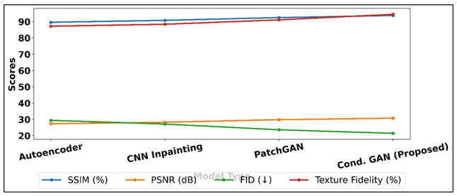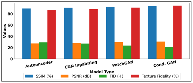 The quantitative analysis of the usage of various models to reconstruct patterns is provided in Table 2 and compares the conventional autoencoders and CNN-based methods with adversarial ones. The findings indicate the higher quality of GAN-driven architecture in their structural and perceptual scores. The autoencoder base displayed good reconstruction results but was affected by blurring features as it used pixel loss functions. Figure 3 provides the comparison of reconstruction quality measures of different deep learning models. The CNN inpainting model had slightly better recovery of texture but the overall coherence among the global and edge transitions. PatchGAN on the other hand showed substantial improvements, with an SSIM of 92.5, PSNR of 29.8 dB and lower FID score of 23.6 meaning that it is more realistic and has better pattern integrity. Figure 3