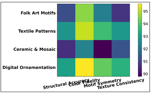 Table 3 shows the relative analysis of the quality of reconstructed patterns based on four different domain datasets, and it is important to note that it demonstrates the versatility and strength of the proposed GAN-based framework. The model is characterized by a high performance in all parameters, i.e. structural accuracy, color fidelity, motif symmetry, and texture consistency with slightly different performances with pattern complexity. Figure 5 demonstrates structural, color accuracy, and symmetry and texture accuracy of datasets. A structural precision of 91.2 was reached in folklore art motifs which essentially reconstructed fine-hand-drawn geometries and color gradients. Figure 5