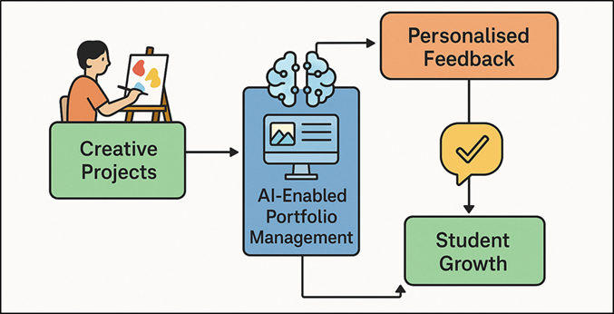 et al. (2025). 2.2. Limitations of Manual Portfolio Tracking and Evaluation Although rich in terms of pedagogy, traditional manual portfolio management systems have a number of challenges which limit their use in creative education in the digital era. To begin with, the abundance and variety of artefacts (including sketches and animations, reflective essays, digital sculptures, and mixed-media experiments) make manual assessment both labour-intensive and time-consuming. Teachers frequently lack the ability to be consistent in the process of assessment, particularly when working with large groups, or when dealing with a lot of subjective art work Farrelly and Baker (2023). Such inconsistency impacts on grading transparency, quality of feedback, and a lack of comparative analysis across time. Second, manual tracking has poor longitudinal insight potential. Teachers have to apply their memory, notes or some random notes to conclude how the skills of a learner would develop in months or years. The visual or conceptual patterns of various artefacts are frequently overlooked, which does not allow intervening meaningfully and providing individual guidance. Equally, the evaluation process that is automated in nature seldom employs the granular features like stylistic preferences, reflective depth, thematic continuity or micro level advancements in technique Cheng et al. (2025). Third, physically or stationary digital portfolios do not contain formal metadata and, thus, can be hard to search, compare, classify, or analyse trends. Teachers both waste a lot of time in struggling to find artefacts that have been poorly organised and students get delayed or inconsistent feedback. 2.2. Motivation for AI-Driven Portfolio Intelligence Assisting in the filling of the most important gaps in the assessment step of the digital learning portfolio and opening the opportunities of individualised and data-oriented art education, the integration of AI into digital learning portfolios is also going to fill the gaps in the assessment workflow that are considered the most significant. Artificial intelligence provides options to work with the multimodal data in a large amount, both visual works of art, sketches, text reflections, audio notes, and process videos, much more effectively than with the help of the manual approach. Machine learning algorithms are able to detect subtle patterns of development, discern patterns and motifs, break down composition patterns and measure change in skill development along with accuracy that is not achievable by humans alone O’Donnell et al. (2024). The need to embrace AI is increasingly becoming an incentive to teachers as it can enhance the provision of prompt, actionable feedback. Similarity matching, automated tagging and creativity scoring, and reflective sentiment analysis make routine processes more efficient and permits instructors to engage in interpretive critique and mentorship Shishavan (2024). Consistency across the assessments is also brought by AI, which minimizes the subjective bias and leaves graded results transparent. To the learners, AI-powered dashboards give feedback on creative development, stylistic advancements, strengths, and the prospective strategies on how to improve. This enhances metacognition and gives students the power to own their artistic experiences Crompton and Burke (2023). Table 1 provides a summary of AI-based methods of digital learning portfolio management in art. Institutionally, AI-based portfolio intelligence helps in managing large-scale programs administration, accreditation functions, and optimising the curriculum. Trends obtained on the basis of the portfolio data may indicate the success of the teaching and the distribution of the skills or lack thereof in the cohorts or the voids in learning results. Table 1