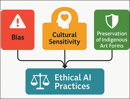 Figure 4 Flowchart of Bias Mitigation and Cultural Preservation in AI Art Education The tools of AI art are vulnerable to cultural bias since the datasets they are trained on tend to display more popular styles of art and globalized aesthetics. This discrimination has the effect of marginalizing indigenous, regional and traditional modes of art, which results in homogenization of creativity. Such prejudice in the academic setting has a threat of weakening cultural diversity and distorting local artistic identities. Figure 4 demonstrates the mitigation of bias and cultural preservation process in AI art education. Ethical sensitivity in AI-enabled art learning is thus a significant area of concern that should be considered culturally. It is important to make students look critically at the way in which AI systems reproduce cultural motifs, symbols, and styles and identify limitations and distortions. Unless they are aware of it, learners can inadvertently create biased or culturally inappropriate works. To maintain the art forms of indigenous communities, targeted incorporation of culturally representative data, community knowledge, and interpretation of surroundings are required. There should be educational policies in favor of cooperation with local artists, cultural institutions and heritage organizations in order to avoid disrespectful representation. 7.3. Mitigation Strategies for Responsible and Equitable AI Usage To improve the mitigation of the associated ethical risks of AI art tools, they will involve a multi-pronged approach, incorporating policy, pedagogy, and technological design. On the policy level, some strict rules on data protection, copyright attribution, transparency, and accountability should be developed. These rules ought to require informed consent, ethical source of data, and the reveal of the AI involvement in the creative outputs. Pedagogically, AI literacy (ethically) is to be part of art education. Learners and teachers should be prepared to understand AI outputs critically, identify bias and ponder over creative responsibility. The focus on process documentation, reflective statements, and human decision-making will facilitate the creative integrity. Responsible AI design is technologically comprised of bias auditing, explainability, and customizable models that enable educators to model tools to cultural and educational settings. Equity can be encouraged through an open-source and public-interest AI platform because it will diminish reliance on proprietary systems. Fair access should also be encouraged by supporting infrastructure, designing inclusively, and underserved communities. Adaptive governance is guaranteed by continuous monitoring, feedback of stakeholders and interdisciplinary collaboration. 8. Conclusion The extensive application of AI art tools in the context of the National Education Policy poses a valid chance to repackage art education in the digital age without losing touch with human imagination and creativity, cultural legacy, and ethical duty. As this paper has shown, AI can become a potent pedagogical facilitator, such as assisting with visual creation, criticism, reflection, and individualized education and learning, but not an artistic skill or human imagination substitute. In combination with the focus on learning competency-based, experiential, and multi-disciplinary learning discussed by NEP, AI art tools can enhance creative activities and increase the access to high-quality art education in a variety of educational settings. To make AI adoption pedagogically significant and coherent at the national level, it is crucial to consider adapting AI to the organized integration framework, which is maintained by multi-layer technological architecture and clear policy guidance. There is also the urgent necessity to invest in teacher training, development of the infrastructure and gradual implementation, taking into consideration institutional readiness and regional diversity. In the absence of such systemic support, AI tools will become partial innovations and not transformative educational tools. Another point that is highlighted in the paper is that AI integration should still be based on ethical and cultural considerations. The problem of data privacy, authorship, bias in algorithms and the display of cultural representations require active regulation and ethics in the field of art education. With the introduction of responsible AI practices and culturally responsive design, the educational system can preserve the indigenous art forms and the freedom of creators and still enjoy the benefits of technological progress.