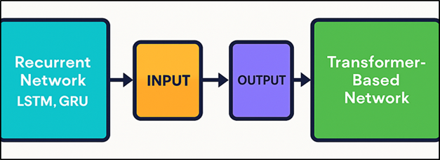 3. Methodology 3.1. Dataset preparation (pose data, video frames, MIDI beats) The choreography generation methodology starts with an extensive dataset preparation procedure that receives various data modalities necessary in choreography generation. Pose data are the fundamental representation of human motion, which come in either by motion capture system or pose estimation on videos of dances. These data are time-indexed joint coordinates giving the kinematic structure of the performer. Raw video frames are simultaneously captured to maintain visual context, space relations and other style clues like body positioning, arm length and body posture. Video data also make it possible to check the accuracy of poses and extend this knowledge to appearance-based features in the future. MIDI beat information is mined out of other music tracks to integrate music structure. MIDI data give direct indications of tempo, beat positions, rhythm and note intensity, enabling them to be programmed with movement and music in perfect sync. In case no MIDI files are found, audio signals are manipulated to recognize beats and rhythmic patterns and transmitted into MIDI-like time indicators. The sequence of dances is divided into synchronized windows at the temporal coordinates of pose path, video frame, and beat marking. There is also metadata like style of dance, range of tempo, and identity of the performer to facilitate conditional generation and control of style. This multi-mod data preparation makes sure that the learning models not only view the physical dynamics of motion but also the rhythmic alignment in movement to music creating a strong basis of expressive choreography synthesis. 3.2. Preprocessing: Normalization, Pose Skeleton Extraction, Sequence Alignment Preprocessing is important in converting the raw multimodal data to structured inputs that can be processed using the deep learning models. Pose skeleton pose estimation Pose skeleton pose estimation is the stage of transforming raw motion capture signals or approximated joint positions into conventional skeleton models. Hierarchies are computed jointly based on anatomical constraints, such that all the samples share similar connectivity. Missing/Noisy background on the values of the joints, which is normal in the process of video-based pose estimation is addressed with interpolation and temporal smoothing, which minimise jitter and discontinuities. It is then normalized in order to enhance the model stability and generalization. The process of spatial normalization is with respect to a reference joint, (say the hip or torso) and normalizes them to compensate performer height variation and variation in camera distance. Temporal normalization brings about the same frame rate in sequences by resampling the motion data to the fixed number of frames/s. The beat sequences in music are also scaled to a usual tempo grid allowing it to be regularly associated with motion frames. Sequence alignment involves the combination of movement and music in time-synchronized streams. 3.3. Model Design: Recurrent (LSTM, GRU) and Transformer-Based Networks The model design is aimed at the complex temporal dependencies and multimodal interaction of the choreography of a dance. The ability to capture contextual information over a long duration of time means that recurrent neural networks, specifically Long Short-Term Memory (LSTM) and Gated Recurrent Unit (GRU) networks are used as a baseline sequence model. These processing models encode and decode frame by frame, and for such processes to be learned, temporal relationships between one movement and the next, one beat of the music and the next, and so on, are required. The explicit memory cells and gating mechanisms allow LSTM networks to be well modelled to work with the long dance phrases with anything resembling the performance with their more efficient computation mechanism that GRUs provide. Figure 1 illustrates recurrent and transformer architecture which allows choreography generation. Transformer-based architectures are added to the framework in order to address the weaknesses of recurrent models in working with very long sequences. To learn global dependencies across the motion sequences of a body part, transformers employ self-attention mechanisms to mimic the recurrent motifs, structural symmetry and long-range coordination of body parts. Multimodal embeddings are pose features that were enriched with beat and tempo information and it is jointly processed using stacked attention layers. Positional encoding is used in order to maintain time in the sequence. Figure 1