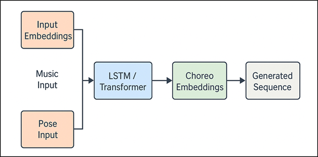 Figure 1 Architecture of Recurrent and Transformer-Based Models for Choreography Generation 4. System Architecture 4.1. Input module: music, rhythm, and movement data streams The input module is the cornerstone of the choreography generation system as it combines various data sources that constitute auditory and physical features of dancing. The input of music can be in the form of raw audio signals or symbolic input in the form of MIDI files which are coded with tempo, beat placement, and rhythmic strength. Based on these inputs, spectral energy, tempo curves and beat onsets are obtained as low-level features that represent the musical structure of the movement dynamics. Streams of rhythm are focused on the time and thus generated choreography is synchronized to musical accents and phrasing. Movement data streams are pose-based skeletal representations, which are generated as a result of motion capture or video-based pose estimation. The positions of joints, angles and relative limb orientations are represented in each frame and create a time-ordered record that captures human motion. Music and movement streams are synchronized in time with a common timestamp structure in order to facilitate multimodal learning. Conditioning variables may include optional metadata (e.g. dance style, emotional tone, performance constraints, etc.) to allow choreography generation to be controlled. 4.2. Feature Extraction Using CNNs and Temporal Encoders The layer of feature extraction converts raw multimodal inputs into informative representations, which are small and can be used in sequence modeling. Convolutional Neural Networks (CNNs) are used to run visual data, such as video frames or heatmap of the position of humans in the space. These networks fly-capture spatial relationships including body posture, limb positioning and inter-joint association which are vital in comprehending movement organization. In case of pose-only input, skeletal connectivity and joint correlations can be effective with the help of graph-based or 1D convolutional layers. The musical features are analyzed using special encoders which derive rhythmic and harmonic patterns out of audio spectrograms or MIDI representations. These encoders maintain time continuity as well as dimensionality reduction that facilitates the effective fusion of multimodal information. The mechanisms of feature fusion integrate a representation of encoded music and movement by concatenation, by attention-based weighting or cross-modal transformers. 4.3. Sequence Generation via LSTM/Transformer Layers The sequence generation component aims at generating timely coherent and expressive choreography based on latent feature embeddings. The recurrent architectures that are applied to capture frame to frame dependencies and gradual change in movement are recurrent architectures like Long Short-Term Memory (LSTM) networks. LSTMs can learn the dynamics of contemporary poses during motion and rhythmic patterns and predict the future progression of the dance, generating an entirely continuous sequence of posts, by remembering internal states of memory. Figure 2 depicts the LSTM Transformer architecture in sequence generation in choreography synthesis. Information flow is controlled by gated mechanisms by decreasing sudden changes and providing biomechanical plausibility. Addition of transformer-based layers is done to improve global sequence modelling. Figure 2