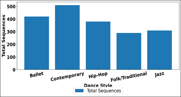 Table 2 shows the structure of choreography data and its distribution on training and validation subsets of the various styles of dances. The collection of data shows equal stylistic diversity including classical, contemporary, urban, and traditional styles of dance. The total generated sequence of dance in each style is distributed as indicated in Figure 3. Contemporary dance adds the most sequences (510) as it has a broad stylistic range and can be studied to learn how to move in a flexible manner. Figure 3