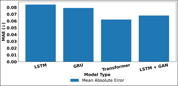 Figure 5 MAE Comparison Across Sequential and Hybrid Prediction Models GRU model has slight improvements over LSTM in all metrics, which is a valid indication of its more efficient gating process and better response to the time dependencies. Figure 6 displays the comparison of FID, smoothness, rhythm alignment of architectures using area plot. Transformer based models show a significant performance improvement with a much lower MAE and FID value and an increased score of Smoothness Index and Rhythm Alignment. Figure 6