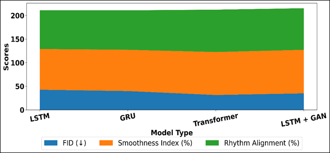 Figure 6 Area Plot of FID, Smoothness, and Rhythm Alignment Across Sequence Modelling Architectures This brings out the success of self-attention in the attendance of long-range dependencies and international choreographic framework. The hybrid LSTM + GAN model goes further to increase the quality of perceptual, as indicated by the improvement of smoothness and rhythm alignment, because of the adversarial training, which promotes realistic motion transition. All in all, the findings suggest that there is a broad evolution of recurrent to attention-based and hybrid generative architectures, and more advanced models are able to generate a more fluid, accurate, and musically synchronized sequence of choreography. 7. Conclusion This paper has provided extensive research on the deep learning models in choreography generation and the ways the model can revolutionize the process of creating, analyzing, and sharing dance. The proposed framework shows how complicated connections between movement and music can be effectively modeled with the help of the current techniques of artificial intelligence by employing multimodal data sources, including pose-based skeletal representations, video frames, and musical rhythm cues. With the shift towards the data-driven deep learning models of the dance sequence creation, the problem of traditional rule-based choreography systems is replaced with the idea of flexibility, colouring stylistic diversity, and expressiveness in the generated dance sequences. Recurrent architectures, such as LSTM models and GRU models, were found to be effective to express local temporal continuity and motion transition, whereas transformer-based networks to be more effective in expressing global sequence coherence and long-range dependencies. The use of modern generative methods also increased the realism and the fluidity, and it solved most of the popular issues like motion stuttering and unnatural transitions of poses. Quantitative measures (MAE, FID, Smoothness Index) of experimental evaluation showed that models based on deep learning could produce choreography, which was rhythmically and visually convincing across a wide range of dance styles. In addition to the technical performance, the consequences of this study are applicable in various fields of application. AI-assisted choreography systems can be used in the field of dance education and training to facilitate personalized learning, objective feedback, and remote training. Like in performance design, the virtual stage simulation and adaptive choreography introduces novel creative possibilities.