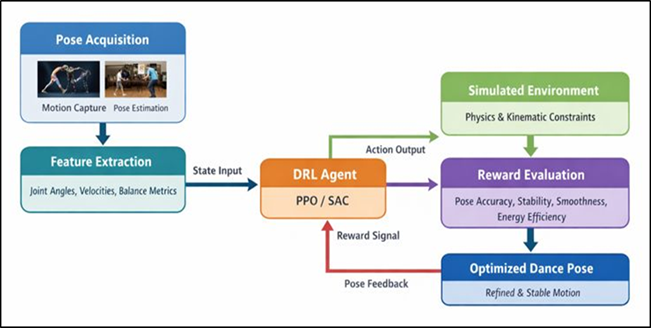 3. Problem Formulation and Theoretical Framework 3.1. Formal definition of dance pose optimization as a Markov Decision Process (MDP) Dance pose optimization is defined as Markov Decision Process (MDP) in order to represent the sequential and decision-making characteristic of human motion. An MDP can be defined as ⟨ 𝒮, 𝒜, 𝒫, acute, γ ∈ (0,1]) where distinctly 𝒮 is the state space, 𝒜 the action space, 𝒫 is the state transition dynamics, acute the reward function, and γ is the discount factor. In every discrete time t, the agent receives the current state s -n - of the dancer which is the pose and contextual motion information, and chooses an action a -n - of the dancer which is an action that alters the pose Izard et al. (2018). The dynamics of the environment then changes to a new state’s n 0 with probabilistic dynamics p(s n 0 | s n, a n) which represent biomechanical constraints and time continuity. The reward term ar(s n, a n, s n +1) represents several goals of interest to dance such as the accuracy of the poses against a reference, balance and smoothness of motion and energy efficiency. The agent is trained to maximize the expected cumulative discounted reward to learn a policy: π(a|s) that generates sequences of poses optimized over time as opposed to single frames Lugaresi et al. (2019). This formulation of MDP, especially in dance, is especially appropriate since it is inherently open to long-horizon optimization to enable the agent to take into account the future feasibility of poses and aesthetic flow. It is also through this theoretical framing that well-established DRA algorithms can be applied in order to have a principled foundation of learning adaptive and expressive policies to control dance pose. 3.2. State Space Representation (Joint Angles, Temporal Dynamics, Balance Metrics) The state space is an important element in the dance pose optimization modelling since it determines the data that the learning agent possesses at a given time step. According to this, the state vector will be formulated to reflect instantaneous pose features as well as the time-varying context. Joint-level kinematic properties of the state (joint angles, angular velocities, relative limb orientations) are calculated on a skeletal model. These parameters have a compressed but expressive description of the pose configuration of the dancer in the present moment. The state is used to include motion history of stacked frames, velocity profiles or recurrent embeddings which condense recent pose transitions Grishchenko et al. (2022). This time data is necessary in motion continuity enforcement and avoiding sudden or unnatural variations of postures. In the absence of time, the actor can optimize single poses and generate sequences which are visually incoherent. Balance and stability signatures also enhance the state representation. These are center of mass projection, relationships of support polygons, joint torque estimates and indicators of symmetry. These characteristics enable the agent to make reasoning to determine whether the physical movements are feasible or not and to be in equilibrium in a dynamic movement. The state space allows the informed decision making by connecting the descriptors of kinematics, time, and the balance, which makes the biomechanical realism and the intent to express intersect. 3.3. Action Space Design for Pose Adjustment and Transition The space of action characterizes the way the agent can affect the pose of the dancer in the time, and it is the main means of obtaining the smooth and manageable movement. Under the proposed framework, actions are represented as continuous valued modification to the joint parameters which may be incremental modification of the joint angles or the target joint velocities. Continuous spaces are better than discrete ones, because the moves in dancing are best viewed as fine-grained and within transitions that cannot be correctly represented by the crudity of action discretization. Action vectors describe synchronized changes in all the joints and allow the agent to learn to move the limbs in sync and not separately. In order to maintain biomechanical validity, action limits are place on anatomy-based limits of the joints, and the limits of the total angular velocities. These bounds originate impractical or dangerous pose specifications and less exploration of impractical corners of the action area. In the case of pose transitions, the design that should be used should facilitate temporal smoothness, disliking acceleration or jerk. 4. Proposed Deep Reinforcement Learning Framework 4.1. Overall system architecture for DRL-based dance pose optimization The suggested Deep Reinforcement Learning (DRL) framework is structured in the form of a modular and end-to-end model, which combines the perception, decision-making, and motion execution in the process of dance pose optimization. It has a pose acquisition module as an initial part, which derives skeletal representations on motion capture data or vision-based pose estimation systems. Such skeletal characteristics will be converted into structured state vectors with description of joint kinematics, time context and balance related information. This information on the processed state is then inputted into the DRL agent which is the heart decision-maker. The DRA agent is used in an environment of simulation or physics-awareness which represents biomechanical limitations and temporal pose dynamics. The environment reacts by taking control actions generated by the agent each time step by changing the joint configurations, and the environment then responds by changing the pose and providing a reward signal. Multi-objective feedback is calculated by using a reward evaluation module that uses pose accuracy, stability, smoothness and energy efficiency. This feedback loop interaction is maintained among long sequences, which allows to optimize dance movements at long horizons. 4.