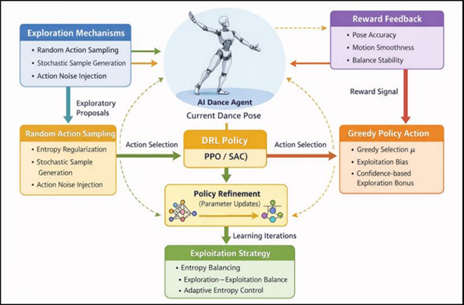 Figure 2 Architecture of Exploration–Exploitation Mechanisms in DRL-Based Dance Pose Learning 5.2. Curriculum Learning for Progressive Pose Complexity Learning of curriculum is also utilized to deal with the complexity character of the dance movements as well as in stabilizing the training of deep reinforcement learning agents. The agent is not presented to full body highly dynamic dance sequences immediately, but rather to simple tasks in the beginning of the learning process. Preliminary training levels concentrate on poses that are standing or even semi-standing and do not have a great number of joints and temporal fluctuation. This helps the agent to gain fundamental balance control and coordination of the joint without having to deal with high-dimensional dynamics. The more advanced the performance, the more pose complexity is gradually introduced into the curriculum, such as more joints, more extensive range of motions and more time-dependent Ness. Dynamism, rhythmic movements, partial choreography parts are gradually introduced, which promotes the agent to generalise acquired skills to a variety of movement patterns. The degree of difficulty in the tasks is also modified dynamically depending on the performance levels such that the agent only progresses when he develops adequate competence in each stage. This planned learning approach makes convergence less unstable and fast by matching task demand and the changing abilities of the agent. 5.3. Reward Shaping and Multi-Objective Optimization The design of rewards is central to directing the learning process with meaningful maximization of outcomes of a dance pose. The suggested framework utilizes the concept of reward shaping which breaks the overall goal down into decipherable units all of which are relevant to a particular aspect of dance quality. These elements are relative precision of the pose to a reference or target pose, the smoothness of temporal change between poses, stability in balancing and energy efficiency. Reward shaping facilitates learning and reduces sparse reward problems that are usually faced in long-horizon problems by giving intermediate feedback. Multi-objective optimization is obtained by assigning weights to individual terms of the reward to indicate their relative weight. As an example, the reward of stability and safety is considered during the initial training and after an agent grows, the rewards of aesthetics and expressiveness are more considered. Adaptive weighting schemes also enable the reward system to change with time, such that optimization objectives are in step with curriculum development. Regularization terms are also included in an attempt to penalize unnatural joint movements, undue acceleration or even anisotropy. 6. Limitations and Future Research Directions 6.1. Scalability to full-body, long-sequence choreography Although the suggested framework of the deep reinforcement learning proves to be effective in terms of dance pose optimization, it is important to note that extending the framework to full-body and full-sequence choreography is a challenge. The number of joints and degrees of freedom increases and the state and action space expand defeating the convergence rate and enhancing the complexity of computation. The use of long choreography sequences also create a problem in assigning temporal credit, in which the effect of early choices in the pose may not be realized until well into the sequence. This complicates learning of policy and leads to the possibility of unstable training. Also, prolonged dance moves are commonly associated with the stylistic variations, change of direction, and switching between movement motifs. The hierarchical or modular reinforcement learning architectures might need to capture such diversity in one policy and add more design complexity. The existing models also can be unable to uphold long-term aesthetic integrity, because local pose optimization does not necessarily imply globally consistent choreography. 6.2. Real-Time Deployment Challenges and Latency Constraints The practical limitation of real-time deployment of DRL-based systems that perform optimisation in dance pose is associated with the latency, computational cost, and system responsiveness. Latencies even as small as these may interfere with the natural movement flow and decrease the usefulness of these systems in form of real-time feedback. The second difficulty is occasioned by the necessity of precise and low-latency identification of poses. The problem of noise, occlusions or frame drop may be experienced in vision-based pose tracking systems, and this can propagate the error into the reinforcement learning policy. Of great importance to real-world application is ensuring that it will not be affected by such uncertainties. Moreover, running models on edge devices or wearable platforms is a very demanding task in terms of memory and power consumption. 6.3. Extension to Multimodal Feedback (Music, Emotion, Rhythm) A significant weakness of the existing framework is that it mainly emphasizes the notion of kinematic optimization, and pays little attention to the multimodal environment of the context of dance. Dance movements are closely connected with music, rhythm, expression and these elements cannot be completely represented using solely the pose-based state representations and reward functions. Consequently, the optimized poses can be technically accurate, but not expressive in a way that they correspond to musical form or emotional purpose. Multimodal feedbacks also come with added problems, namely, representation and synchronization of heterogeneous data streams like audio features, beat structure, and affective cues. To implement these modalities into the framework of the reinforcement learning, significant attention should be paid to the design of the states and rewards in order to guarantee that movement and the external stimuli are meaningfully correlated. The way forward in fu