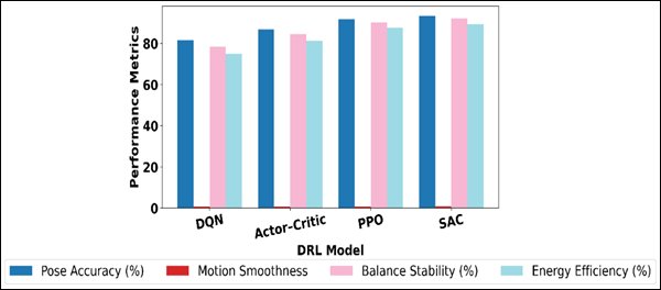 Figure 4 DRL Model Performance Across Control Dimensions There is a modest increase in the Actor-Critic model, with 86.9% pose accuracy and improved balance of 84.6% of the times, which shows the advantage of policy-value separation in the learning of coordinated motion patterns. PPO further increases performance to 91.8% pose accuracy and smoothness score of 0.83, which implies that the learning becomes more stable and the transition of poses is more constant. 7.2. Ablation Study on Reward Components and State Representations A study that ablated components of rewards and design of the state representation was conducted to determine the effect of these two on the performance of learning. The removal of temporal smoothness rewards caused sharp changes of poses and a lack of motion coherence, although the poses remained accurate. Omission of balance-related rewards led to shaky and physically unsustainable postures. In the same manner, state representations that were simplified and did not have time context also resulted in a performance drop since the agent could not foresee future pose feasibility. On the contrary, the addition of balance measures and motion history was a significant enhancement of the stability and visual quality. The results of these studies indicate that well designed rewards and rich representations of state are vital to obtaining strong, expressive, and physically sound optimization of dance poses with the help of DRL. Table 3