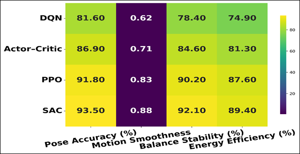 Figure 3 Comparison of DRL Model Performance Metrics DQN has the lowest scores on all of these metrics, with pose accuracy of 81.6% and motion smoothness of 0.62, indicating that it has a weakness in operating on continuous, high-dimensional action spaces, which are common to human dance movements. Figure 4