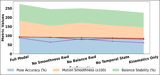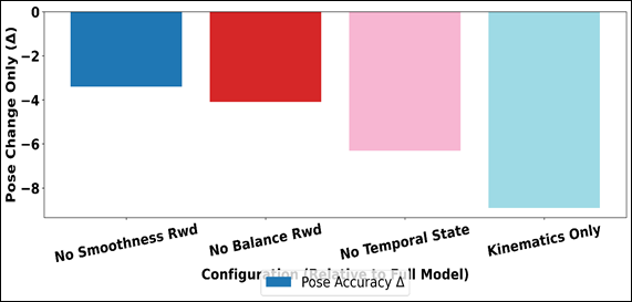 Figure 5 Ablation Analysis: Area Graph of Pose, Smoothness, and Balance Across Configurations The effectiveness of simultaneous modelling of kinematic, temporal, and balance-related data in a multi-objective reward framework was proven by these results. Figure 5 illustrates the effect of components on pose accuracy, smoothness and balance stability Eliminating the smoothness reward causes a significant loss of motion smoothness, which drops to 0.64, but pose accuracy does not substantially decrease. Relative performance degradation is indicated in figure 6 in the presence of deletion of key elements of DRL. This shows that the smooth transitions do not automatically follow and have to be encouraged with the help of incentives. Figure 6