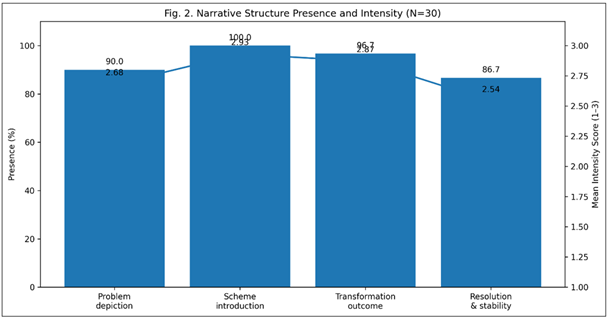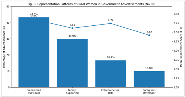 Figure 2 Narrative Structure Presence and Intensity in Women-Centric Government Advertisements (N = 30). Figure 2 has shown the dominance and popularity of various storytelling phases applied in government advertisements. The scheme introduction and transformation outcome stages have the highest presence and mean intensity scores, which means the emphasis is put on explicating the scheme and demonstrating positive change. Although slightly reduced, the problem depiction and resolution phases, nevertheless, reflect a significant narrative intensity, as it suggests a relevant problem-solution-consequence story pattern with the aim to increase the awareness and emotional involvement of the rural women. 4.3. Representation of Rural Women The roles and portrayal of women were coded into mutually exclusive groups, in terms of counts of frequency and proportional representation. Figure 3