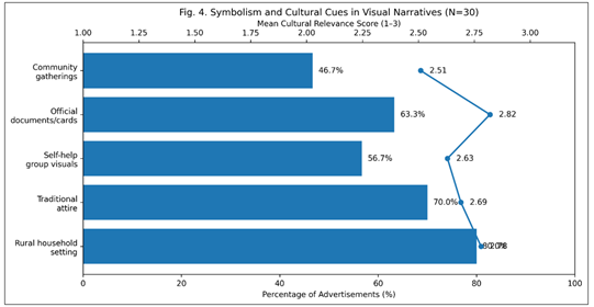Figure 3 Representation Patterns of Rural Women in Women-Centric Government Advertisements. The number 3 shows the proportionality of the types of representations and their average scores of empowerment, but it is evident that the empowered individual depictions predominant, but the culturally supportive family-focused narratives are still present. The dominance of empowered personage depictions shows that there is a decisive policy focus on agency in women though images supported by the family are still prominent to the issue of cultural acceptance. 4.4. Symbolism and Cultural Cue Usage Presence and contextual relevance was coded as symbolic elements. Several symbols may be used within one advertisement. Figure 4