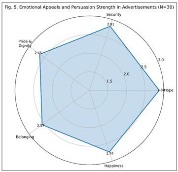 Figure 4 Symbolism and Cultural Cues Used in Visual Narratives of Women-Centric Government Advertisements. It is shown in the Figure 4 that the symbols of rural household and official documents are the most common based on culture and have a high mean score on cultural relevance, meaning that the government advertising has strong contextual anchoring and trust building strategies. The scores are high on relevancy, and this shows that cultural anchoring is effective, which builds trust and understanding amongst the rural audiences. 4.5. Emotional Appeals and Persuasive Strength Coding and rating were done using a 3-point scale as an indicator of the strength of emotional appeal. Figure 5
