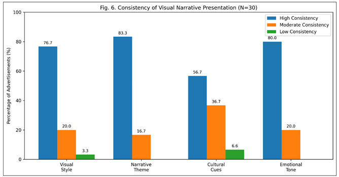 Figure 6 Consistency of Visual Narrative Presentation Across Women-Centric Government Advertisements. In Figure 6, a comparison of high, moderate and low levels of consistency is made concerning the major dimensions of the narratives. Findings have shown very high levels of consistency in visual style, narrative theme, and emotional tone, whereas cultural cues show relatively moderate levels of consistency, which implies that government advertising can be customized more regionally and culturally. 5. Policy and Communication Implications 5.1. Implications for Government Policy Design According to the results of the present research, the quality of visual communication approaches towards the promotion of government schemes that are women-centric is strictly connected to the successful results of the policies. Although the conventional way of policy making is based on financial distribution, eligibility standards, and structures, the findings reveal that the visual stories have a major role to play in determining whether policies are comprehensible, credible, and implemented by the rural women. Accordingly, visual communication must be considered as part and parcel of the policy design and not peripheral promotion activity. Communication planning at the policy formulation level should be integrated by the policy-makers so that the objectives of the schemes are translated into visual stories that can be easily understood. Storytelling based on transformation, where it is evident how a vulnerable person was transformed to see oneself as empowered, must be an integral part of policy outreach strategies. Moreover, the policy documents and guidelines must require beneficiary-centered visual representations that capture the realities of the rural setting and hence enhance acceptance and engagement on the grassroots. 5.2. Implications for Public Advertising and Communication Strategy Communication-wise, the research points out that emotionally engaging, culturally based, and coherent visual messages should be included in the governmental advertising. Emotional appeals like hope and security that proved to be the most persuasive ones should be placed strategically to be trusted and relevant. But emotional narration should be accompanied by a sense of clarity in the information so it does not perpetrate false hopes that seem impossible to achieve. Another critical aspect that is highlighted by the results is the balance of representation. Advertisements are to remain the empowered women and at the same time, family and community situations should be considered to influence decision-making in rural regions. This kind of equal representation does lessen opposition and improve social legitimacy especially in conservative families. Besides, the same should be applied to the media channels, including television, outdoor, print and online as the consistency to strengthen the recollection and credibility. A similar visual identity, storylines, and tone of emotion assist in creating a familiar communicative structure, which can be readily identified by the rural viewers to government programs. 5.3. Localization and Cultural Sensitivity Although the research reports a good performance in overall narrative effect, average inconsistency in the localization of cultural cues implies that it can be improved. The advertisement campaign conducted by the government must be regionally oriented with the use of the local languages, dialects, clothing, symbols and social activities. Localization creates a better sense of relatability and makes visual narratives more appealing to various communities in the countryside. The policy communication agencies are to cooperate with the local stakeholders, self-help groups, and grassroots organizations in order to co-produce visual contents that meet local aspirations and challenges. This kind of participatory communication practices can help to create more authenticity and avoid the discrepancy between what is said in advertisements and what is experienced in life. 5.4. Bridging the Intention–Action Gap Among the most drastic research implications, the gap between the intention and the actual participation is identified. Although the visual narrative is instrumental in motivating the rural women and creating interest, structural and procedural obstacles tend to curtail action conversion. The policymakers should, therefore, supplement the effective advertising with the simplified process of enrollment, the clearance of documentation guidelines, and the availability of support mechanisms. Visual communication may not only stop at the creation of awareness; it can also be used procedurally to offer step by step visual instructions of scheme enrollment, services usage and grievance redressal. By combining informational images with emotional stories, one will be able to make the situation less uncertain and make women act in a more tangible way. 5.5. Implications for Monitoring and Evaluation The research shows the worth of incorporating quantitative metrics of visual narrative assessment methods, including Visual Narrative Effectiveness Index (VNEI), into the assessment systems of governments. Narrative effectiveness can be regularly monitored by policymakers to determine the most influential visual strategies and can refine campaigns based on the obtained data. The evaluation systems need to go beyond the reach and frequency measurements and incorporate measures of awareness, perception, trust and participation. Adaptive communication strategies may be further improved by feedback loops with responses by the beneficiaries as well as by guarantees continuous improvement. 5.6. Implications for Gender-Inclusive Governance At a larger scale, the results support the idea of visual narratives contributing to the development of inclusive governance regarding gender. Government advertising allows changing the gender norms and strengthening women agency in the rural area by depicting wom