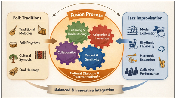 Figure 2 Integration Strategies for Folk and Jazz Music 4.1. Modal Improvisation and Folk Scales Modal improvisation is an essential connection between jazz and folk music. Contrary to the functional harmony based improvisation, modal jazz lays stress on the scale based exploration, tonal centers that are maintained, and development of the melodies over longer periods of time. This style is consistent with folk conventions, which are based on modes instead of chordal progressions as their major organization form. Folk scales is a category of scale that in many cases can be quite easily translated into jazz by addressing it as an improvisational scale but not a harmonized melody. Improving through folk-based modes helps jazz artists to interact with the melodic identity of the source tradition directly. Unobtrusive embellishment, intonation, and phrasing borrowed with folk performance habits may be introduced into jazz improvisation, enabling the improviser to avoid cultural loss but to be free of creativity. The modal improvisation therefore allows an expansion, diversification, and reinterpretation of folk melodies without being absorbed into heavy harmonic frameworks and thus distorting their original nature. 4.2. Rhythmic Syncopation and Polyrhythmic Adaptation Rhythm is one of the major expressive elements of jazz and folk music but it is expressed differently in both traditions. Among the different features of jazz improvisation are the application of syncopation, swing feel, and rhythmic interaction among the members of the ensemble. These methods give a loose system of introducing folk rhythmic patterns such as asymmetric cycle and repetitive rhythmic patterns. Polyrhythmic adaptation enables the musicians in jazz to superimposition several rhythmic patterns based on folk traditions so as to develop sophisticated temporal textures without losing the underlying pulse. As an example, a traditional folk rhythm can be preserved in the rhythm section as the soloists add syncopated changes or cross-rhythms. This style values the rhythmic nature of folk as a cycle but complements it with the improvisational nature of jazz. The rhythmic play creates the folk rhythms to be alive, dynamic and not fixed structures. 4.3. Harmonic Reinterpretation of Folk Melodies Harmonic reinterpretation is one of the most unusual additions of jazz to the recontextualization of folk music. A great deal of folk music is traditionally monophonic or minimally harmonic, with the melodic deep-line and rhythmic stress as the major sources of musical expression. Expansion of harmonic possibilities in jazz improvisation is achieved by methods like harmonic substitution of chords, interchange of modes and reharmonization, where folk melodies can be placed into more enriching harmonic settings. But reinterpretation of harmony needs to be restrained and culturally sensitive. Excessive harmonization may swallow the melodic simplicity with which folk music acts as an expressive medium. One approach used by jazz musicians to address this difficulty is to use open harmonies, pedal points or modal vamps to facilitate melodic improvisation without providing too much harmonic complexity. Jazz harmony through such strategies adds to, and does not substitute, the melodic and emotional content of folk material. 4.4. Collective Improvisation and Call-and-Response Another of the pillars of the early jazz is collective improvisation, which has been an effective tool of expression in modern practice. Such an approach reflects the participatory and collective essence of most folk cultural practices, where music is not created by a virtuosity vacuum. Patterns of call and response, where folk music usually features, are easily converted to jazz ensembles, and the dialogue between soloists and rhythm sections and supporting instruments. Collective improvisation in folk-jazz integration provides the possibility to have several voices of different cultures within one performance. Every musician also adds his or her interpretation when reacting to the similar musical signals, resulting in an overlay of sound and interaction. Such a participatory practice supports the concept of music as social practice, which corresponds to folk traditions that underline the importance of collective expression and collective ownership of musical accounts. 4.5. Improvisation as Cultural Negotiation In addition to technical performance, improvisation as a cultural negotiation in the folk-jazz fusion. Jazz artists have to be constantly aware of the need to adhere to the norms and the urge to innovate. In this negotiation, there comes decisions that are to retain elements, reform in others and how to conceive folk material in contemporary performance circumstances. In this regard, improvisation is not only an ethical but also an artistic practice. Through the experience of the tradition of source, its rhythms and modes, and cultural connotations, musicians are able to produce hybridized manifestation, respecting tradition yet adopting expression through contemporary means. This paper takes jazz improvisation not as a musical method, but as a reflective inquiry where continuity and innovation in culture is vigorously perpetuated. 5. Recontextualizing Folk Music Through Jazz 5.1. Adaptation of Folk Themes into Jazz Forms Recontextualization of folk music in jazz will start with the modification of the traditional themes into the contemporary jazz. The folk melodies, rhythmic motives or lyrical forms are frequently preserved as the central thematic content and are embedded in jazz forms like head-solo-head or modal vamps or open-ended improvisational forms. This arrangement of structure enables folk material to serve as an identifiable point of reference and a point of creative experimentation. Instead of utilizing folk themes as fixed quotations, jazz artists frequently cut, transposed or played rhythmically with them in improvisation. This has changed the melod