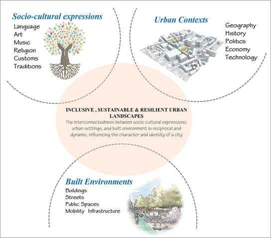 1. INTRODUCTION Human settlements embody the cultures that constructed them, shaped across generations by an evolving comprehension of environmental dynamics and societal needs. Yet, the built forms of these places can often outlive the society that created them, and globalisation has led to a shift in the way cities look and feel Eldemery (2009). The complex and multidimensional effects of advanced capitalism and neo-liberal policies on urban form are still a topic of discussion among academics and decision-makers. While some contend that these policies have aided in the widening of social and economic inequalities in the built environment, others contend that they have facilitated urban growth and development. The livability, equity, and sustainability of cities have reportedly suffered as a result of these tendencies, according to evidence. However, cities are remarkably resilient and have the ability to evolve and adapt over time in order to be timeless and relevant. There are numerous examples of urban forms that have adopted innovative and sustainable urban development techniques to maintain their significance while also transforming the constantly changing needs of their inhabitants Glaeser (2011). For instance, cities like Paris, London, and Barcelona have been able to keep their traditional urban form and architectural style while simultaneously adjusting to contemporary needs. While new infrastructure and transportation systems have been developed in these cities to meet evolving means of transit and mobility, historic structures and neighbourhoods have been maintained and rehabilitated. There are other cities that have embraced social and economic inclusion, like Seoul, Barcelona, and Berlin. To address issues of inequality and social exclusion, these cities have implemented policies and programmes that assist small enterprises to enhance the quality of life while also providing affordable housing and community development projects. These examples demonstrate that it is feasible to design locations that pay respect to the past while also being a part of the present and can act as models for other cities. Settlement patterns are the visible manifestations of a community's social and cultural ideals. A location's settlement pattern is shaped by the distinctive amalgamation of numerous urban components, including its streets, public spaces, green spaces, and built forms. The positioning and style of buildings can have a big impact on a place's character and significance. Therefore, while introducing new buildings, it is crucial to take the present style of architecture and the local setting into account. Early 20th-century modernist architecture frequently places an emphasis on originality, which can result in structures that don't fit in with their surroundings. The need to respect and enhance the local architecture could often be in conflict with this. Nevertheless, it is possible to conceptualise innovative designs while simultaneously rendering respect to the existing built environment, historical relevance, and existing urban fabric. This strategy necessitates sensitivity to and comprehension of the situation and community needs. To preserve a location's cohesiveness and distinctive identity while also fostering growth and innovation, careful consideration of how new built form development may affect the existing urban fabric is crucial. 1.1. Socio-Cultural expressions, Urban Contexts and Built Environments The relationship between socio-cultural expressions, urban context, and built environment is complex and dynamic, involving several variables and interactions. It refers to the extent to which closely related and interdependent a city's or urban area's physical, social, and cultural components are. It recognises that an urban area is more than just a physical location; it is also a space for culture and social interaction between people and the built environment. The diverse means by which individuals display their culture and social identities, including language, art, music, religion, customs, and traditions, are referred to as socio-cultural expressions. The urban setting and built environment, which include components like geography, history, politics, economy, and technology, form these expressions, which have a strong social and cultural underpinning. A thriving street art scene, for instance, can transform a deteriorating neighbourhood into a cultural centre, and traditional religious beliefs can affect the design of religious structures and public spaces Naghizadeh (2000). The urban context refers to the physical, social, and economic characteristics of urban areas, including their size, population, infrastructure, and built environment. Urban contexts can shape socio-cultural expressions by providing spaces and opportunities for artistic and cultural activities, as well as by influencing the social and economic factors that support or hinder these expressions Granham & Thomas (2007). Buildings, streets, public spaces, and mobility infrastructure collectively comprise the built environment, which is crucial in determining both socio-cultural expressions and urban environments. Cultural expressions and activities, as well as the social and economic forces that sustain them, are impacted either positively or negatively by the way these places are designed and used. An opportunity for social contact and cultural expression, for instance, can be provided by the design of public areas like parks, plazas, and cultural institutions. Additionally, the urban environment can have an impact on the kinds of socio-cultural expressions that develop and flourish in a certain location. For example, while a homogenous or segregated urban context may limit the range and quality of cultural expressions, a diverse and inclusive urban context may encourage the emergence of new cultural expressions and creative practices (Refer Figure 1). Figure 1