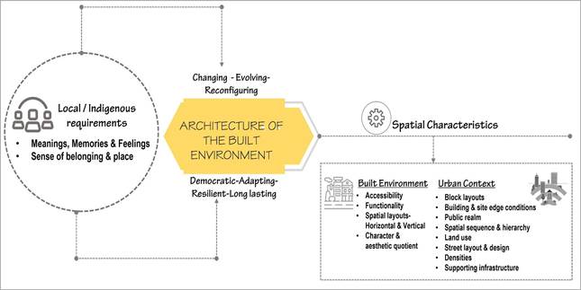 correlation between inhabitants, built forms, urban context, and socio-cultural