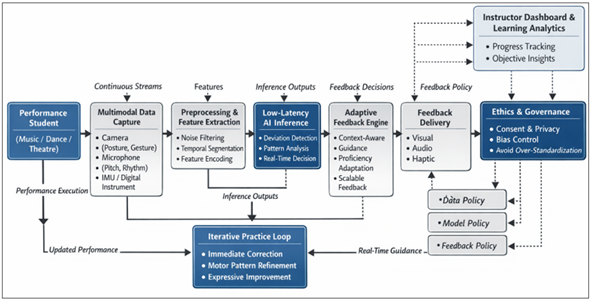 1. INTRODUCTION The elements of performance-based education, including music, dance, theatre, and other studio-focused activities, are based on the principle of iterative practice, the acquisition of skills through embodiment, and the quality and timely feedback. Immediacy and accuracy of corrective instructions during the performance execution are the main factors contributing to the effectiveness of learning in these domains Baker (2021). Nevertheless, the conventional feedback methods of performance education are mostly instructor-focused, intermittent, and retrospective, and usually they are provided after practice sessions or live performances. This form of delayed response prevents the learner by being able to correct errors as soon as they occur, internalize the best motor patterns and refines the finer expressive details, especially in the context of a large-class or resource-intensive learning environment Hwang et al. (2020). New opportunities to add to the feedback process in the performance learning setting have been created due to the recent advances in artificial intelligence (AI), sensor technologies, and real-time data processing. Real-time AI feedback systems take advantage of data streams in real time that are gathered with cameras, microphones, inertial sensors, and digital instruments to analyze learner performance in real time. Using machine learning and deep learning models with low-latency inference capability, these systems are able to identify the occurrence of deviations in the preferred performance trends and produce real-time and context-sensitive feedback Holmes and Tuomi (2022). This is the change of post-hoc assessment to live assessment and is indeed a great move to the operationalization of formative assessment in performance education. Pedagogically, AI feedback in real-time is very consistent with the known theories of experiential learning, deliberate practice, and embodied cognition. Real-time feedback minimizes the timing between action and reflection, thus permitting the learners to perform corrections on their movements, timing, and expressive features of their movement repeatedly through a course of practice and not being dependent on a retrospective assessment. Moreover, AI-based systems provide the prospect of the reliability, objectivity and scalability of feedback to overcome the issues of subjectivity, instructor burnout and the inability to pay individual attention to the learners in a conventional studio-based education. Although the AI-assisted learning tools have been of increasing interest, much of the current literature on the subject has focused on the post-performance analytic tools, automated assessment or offline tutoring systems Săseanu et al. (2024),Wu (2023). The design, implementation and learning impact of real-time AI feedback regarding performance based learning scenarios are understudied, especially in the context of multimodal analysis, adaptive feedback mechanisms as well as low-latency system architectures. Besides, the issues of excessive standardization of performance, dependence of the learners on automated signals, and the ethical considerations of data capture require close scrutiny. 2. System Architecture for Real-Time AI Feedback The real-time AI feedback system architecture in the performance-based learning is built on the theory-to-system mapping delivered in Table 2, the architecture is built to focus on immediacy, adaptivity, and embodied interaction and offers scalability and instructional relevance. Instead of being an independent evaluation system, the system is envisioned as a progressive learning system that incorporates sensing, inference, feedback, and analytics into a single pipeline Ju (2023). The multimodal sensing layer forms the core of the architecture, which is tasked with the responsibility of recording real- time performances data when there is a learner execution of the same Krause et al. (2024). The sensing layer is constructed in such a way that it does not alter the embodiedness of the performance activity, so the data capture process is non-intrusive and conforms to the nature of the natural practice conditions. It directly endorses the cognition of the body and experiential learning in that it keeps the learner engaged throughout. Figure 1