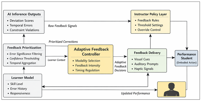 Overview of a Real-Time AI Feedback Framework Illustrating Multimodal Sensing Data captured pass into the preprocessing and feature extraction layer, which changes raw signals to organized forms of data which can be analyzed in real time. Noise filtering, temporal segmentation, normalization, and domain-specific feature encoding are some of the important operations. This layer is performance-oriented, since real-time feedback has a very stringent latency requirement, and many are based upon lightweight algorithms and edge-level computation. The main element of the architecture is the real-time AI inference engine as shown in Figure 1, which compares the current performance with learned or predefined performance models Cabero-Almenara et al. (2020). These models can be obtained based on the demonstrations of experts, annotated dataset, or pedagogical rubric and are applied with the help of machine learning or deep learning methods that can make quick inference. The inference engine continually detects deviations and analyzes patterns, which causes one to be able to detect errors or inefficient execution immediately. This element implements the concept of deliberate practice theory as high-frequency and targeted correction is facilitated during performance execution Choi and McClenen (2020). Decisions made by the inference engine are sent to the adaptive feedback generation module where the modality, intensity and timing of feedback delivery are determined. Feedback can be visual, auditory or haptic and dynamically changed according to the proficiency of the learners, the complexity of the task and responsiveness observed. This dynamic control is critical in controlling the cognitive load and avoiding overloading of feedback, thus maintaining attention and flow of creativity of the learner Xiao and Yi (2021). Lastly, the architecture will have a learning analytics and instructor dashboard layer, which will be an aggregation of performance metrics and feedback logs but will not interfere with the real-time operation. It is an instructional layer that promotes formative assessments and instructional supervision by offering the instructors longitudinal perspectives of progress made by the learners, the common challenges, and the development patterns of skills. Notably, the instructor will still be in the role of a pedagogical mentor and AI will be a collaborative co-agent and not an authoritative evaluator. 3. Adaptive Feedback Design and Pedagogical Strategies Real-time AI feedback is effective in performance-based learning not just because it has to be correctly inferred but because the feedback is designed, scheduled, and provided to the learner in a manner that is effective. Unwell-structured feedback may interrupt performance process, overload cognition, or unwillingly limit the creative expression. The principle of feedback relevance and proportionality is at the heart of the adaptive feedback design Castrillón et al. (2020). In conventional teaching, professional teachers only interfere when there are pedagogically important mistakes. Computer-assisted AI systems can do this selectivity in real-time using thresholding, estimation of confidence and averaging of inferences over time Omali and Garba (2024). Instead of responding to each small error, the system determines errors which are persistent or structurally significant, such as repeated timing error, chronic posture error, or breaking of safety limits, and focus on this feedback Roig-Vila et al. (2020). This will avoid excessive feedback and helps maintain the attention of the learners. The modality of feedback is significant to the preservation of embodied and temporal integrity of performance as seen in Figure 2. The spatial and postural corrections are well executed using visual feedback, including overlays or even trajectory indicators, which can be a source of competition with visual focus on more complicated tasks. Auditory feedback is suited to time direction such as rhythm, pacing, and synchronisation whereas haptic feedback gives fine, non-obtrusive correction on balance or forces related adjustments. Adaptive systems are dynamic to choose or blend modalities according to the requirements of the task and the patterns of response of the learner, to make sure that the performance of the learner is not interrupted but complemented by feedback. Figure 2