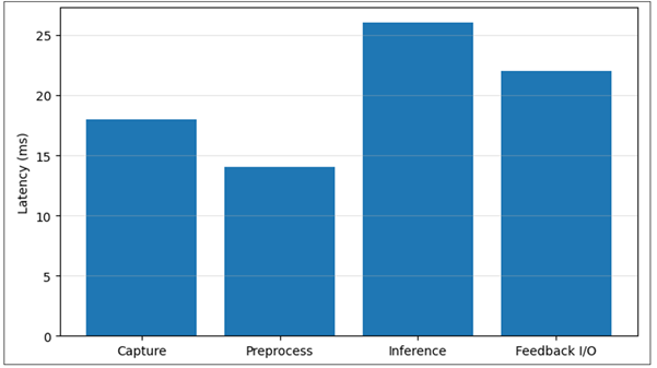 End-to-End Latency Breakdown The major metric at the system level is the end-to-end feedback latency, which is the time that has passed since sensor acquisition to delivery of feedback. This measure is slightly broken down into capture, preprocessing, inference and feedback I/O phases to determine the bottlenecks and prove the real time constraint. Fig. 3 shows a sample latency profile (representative), which is a visual depiction of how the architecture can be set up to provide low-latency functionality by way of simplified preprocessing and optimized inference. Besides the latency, the stability of the system is measured with the throughput (frames/sec) of video and stream continuity (audio and IMU signals) to ensure favorable performance throughout the entire practice. Figure 4