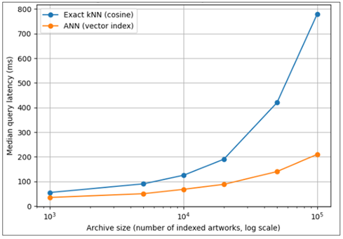 The combined outcomes in Table 2 through IV prove that successful digital archiving of folk art involves the need to embed imbalance conscious learning strategies (embedding-centric) instead of the traditional classification pipelines. The framework proposed overcomes the challenge, as long-tailed distributions and stylistic diversity are explicitly addressed, which implies that the rare motifs are represented equally and the semantic retrieval is robust. In terms of digital heritage, these findings indicate that machine learning systems can go beyond their passive storage to active, equitable and scalable archival systems. 5. Archival Retrieval, Indexing, and Query Performance In this section the proposed digital archiving framework is discussed at the system level in terms of embedding-based indexing, efficiency in retrieving, scaling and fairness among the motif classes. Unlike classification-focused assessment, here, the special attention is given to the behavior of query executions and usability of the archives under conditions of real deployment. Such embeddings allow similarity-based retrieval based on cosine distance and also allow scalable indexing with the help of vector search structures. In order to determine the efficiency of retrieval, median query latency was determined as a function of the size of the archive. Archive size is also expected to positively predict retrieval latency with both exact k-nearest neighbor (kNN) search and approximate nearest neighbor (ANN) indexing as indicated in Figure 2. Exact kNN also shows almost linear behavior in terms of query time and can no longer be used with large-scale archives. By contrasting, ANN-based indexing can sustain sub-second latency at larger sizes of the archive, and thus is better suited to digital archiving systems that are interactive. Figure 2