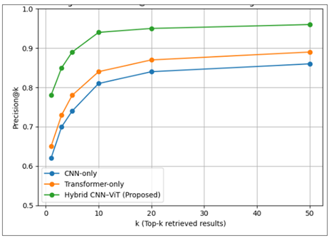 Figure 2 Retrieval Latency vs. Archive Size (Exact kNN vs ANN indexing) These findings show that there is an effective ratio between system responsiveness and retrieval accuracy through the use of embedding-based indexing and ANN search. Notably, the fact that feature learning and storage have been decoupled allows the incremental expansion of the archives without having to retrain the underlying model, as shown in Figure 2. In addition to latency, one important demand of cultural archiving systems is retrieval quality. Precision measures were used to measure retrieval performance, which are the ratio of the top-k retrieved artifacts to the semantically relevant ones. Transformers only, hybrid CNN-ViT models. The hybrid architecture proposed continues to perform well over all values of (k) with high precision even in the case of large retrieval sets, as demonstrate it in Figure 3. Figure 3