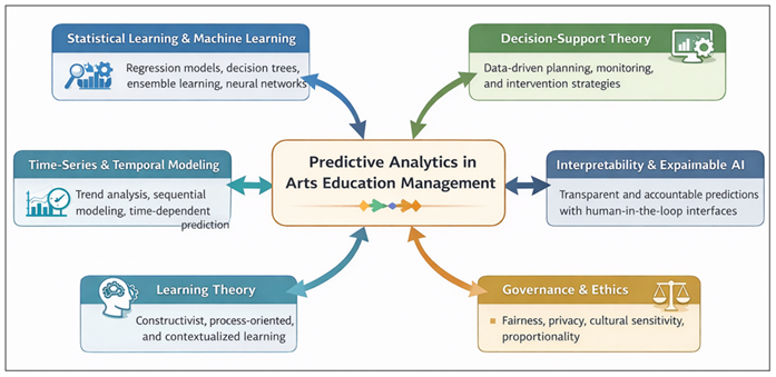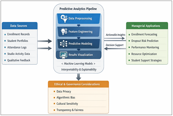 1. INTRODUCTION The administration of arts education institutions is experiencing a paradigm shift due to the rising access to educational data and the need to increase the use of evidence-based decision-making. Conventionally, arts education management has given high importance to experiential judgment, qualitative assessment, and post-activity analysis of student performance and institutional outcomes Sáez-Velasco et al. (2024). Although these methods acknowledge the subjective and expressive aspect of artistic learning, they may not be able to predict the upcoming trends in terms of student enrollment, student retention, student academic growth, the use of resources, and sustainability of the institution. This responsive mode of governance is becoming less adequate in a digital learning environment, hybrid studio environment, and data-intensive administrative environment El Mahmoudi et al. (2025). Consequently, predictive analytics has become a potential paradigm of strategic planning and operational management in arts education management. Predictive analytics can be defined as the tactical application of past and current data, statistical modeling and machine learning systems to predict the future and discover latent trends that cannot be easily observed with descriptive analysis on its own Aldoseri et al. (2024). Predictive models in education systems have been studied extensively to be used in predicting dropouts, performance, early warning and optimizing resource in education systems. But most of the current studies have centered on science, technology, engineering and mathematics (STEM) education or massive online learning atmosphere Relmasira et al. (2023). Arts education has a unique set of features such as the studio-based pedagogy, the portfolio-based assessment, the subjective grading rubrics, and the various learner patterns that create unique challenges to the traditionally used predictive modeling techniques. These features require domain-aware analytics systems capable of supporting both quantitative and qualitative signal types of creative learning Albar (2024). Figure 1