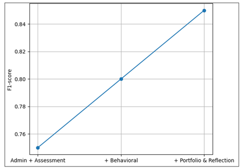 Analytics The contribution of feature engineering is further explored in Figure 5 which shows how the predictive performance increases with the introduction of richer feature sets. The addition of indicators of behavioral engagement gives a significant improvement in F1-score, and the introduction of portfolio and reflective features results in the greatest performance increase. The trend affirms the idea that creative learning paths would be better characterized using process-based and multimodal pointers instead of administrative or assessment data per se. The findings confirm the conceptual assumption that analytics in arts education should focus on learning processes, reflection, and practice to attain significant prediction results. Figure 6