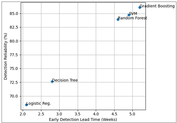 The three features of portfolio evolution and reflective indicators are greatly contributing to predictive sensitivity especially when it comes to early recognition of the disengagement risks that are not apparent in grades. One of the managerial needs of arts education is the capacity to spot at-risk learners prior to performance deterioration. The lead time of early detection was determined as an average of instructional weeks between prediction and disengagement. Table 5