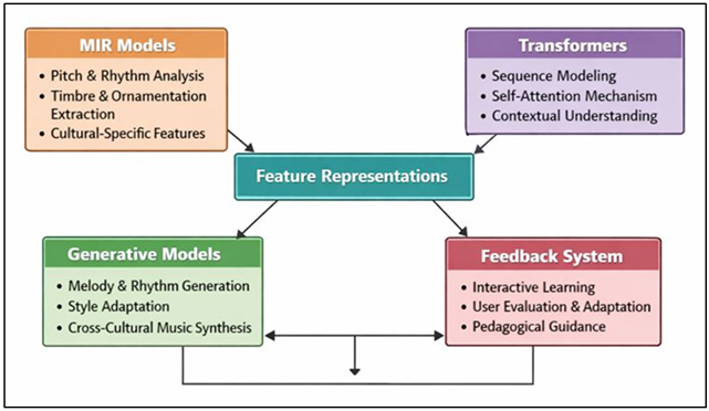 3. Methodology 3.1. AI tools used: MIR models, Transformers, generative models, feedback systems The suggested approach uses a combination of several AI applications to consider analytical, generative, and pedagogical needs of learning music across cultures. MIR models constitute the bottom layer, which allows retrieving low-level and mid-level musical features, e.g., pitch contours, rhythmic patterns, timbral features, and ornamentation patterns. They are trained on culturally diverse data to learn to embrace variations between the musical traditions of different cultures, such as non-Western tonality systems and more complicated rhythm patterns. The feature representations that are produced by MIR modules are the inputs to the higher-level learning components Alexander (2024). Long-range temporal dependencies in melodic and rhythmic sequences are modeled with the help of transformer-based architecture. The system enables them to capture contextual relations that are important in their understanding of phrasing, improvisation, and stylistic continuity across cultures because of their self-attention mechanisms. Synthesizing culturally informed examples of music, other ornamentations, and transformed notations are generated via generative models, such as sequence-to-sequence and diffusion-based models, and can aid exploratory and creative learning. Figure 1 demonstrates unified MIR, transformer, generative models, which allow one to learn music across cultures. Through these models, learners can juxtapose the stylistic interpretations of the traditions and at the same time, the structural coherence is sustained. The pedagogical interface of the framework is made up of feedback systems. The system uses adaptive feedback of the use of pitch, interpretation of rhythm, pronunciation, and expressive nuances by converting real-time audio data analysis with cultural representations learned. Figure 1