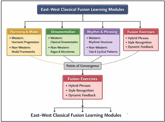 Figure 2 AI-Enabled East–West Classical Fusion Learning Framework As the case study of East West classical fusion shows, the proposed AI-enabled system will empower the learners to work with amalgamated musical forms that will combine western classical modes with non-western melodical and rhythmic traditions. Fusion learning modules are structured on the principles of parallel presentation of the stylistic aspects, which gives the learners an opportunity to discover the relationships between harmonic progression, modal structures, ornamental features, and rhythmic phrasing. The AI-based style recognition can determine culturally specific aspects in each tradition and illustrate the points of agreement and disagreement in the fusion pieces. Figure 2 indicates that AI is capable of facilitating systematic learning on the fusion of East and western classical music. Students will work with modular activities that processively incorporate both systems in them. 5.2. Indigenous and folk music learning supported by AI annotation The second case study is indigenous and folk music learning, in which the oral tradition, community, and variability of style are the main aspects. The AI annotation tools are used to complement the documentation, learning, and interpretation rather than disrupting the conventional pedagogical methods. Audios are marked cultural significances, such as phrase marks, rhythmic patterns, ornamentation styles and performance environment and contextual footnotes. To help the learners, the AI system allows annotating these passages, then playing them up and down and practicing something specifically. Instead of fixed scores, the system is focused on flexible representations, representing oral traditions. Learners are able to change the speed of the recording, isolate stylistic elements, and compare the performance of the same piece in several different ways to learn to tolerate certain variation. Pattern recognition with the usage of AI emphasizes repetitive features and still allows seeing unique expressive variations. The community professionals and bearers of tradition will be involved in the process of designing annotations and verifying them, making sure that cultural meanings are properly reflected. Educators combine AI markups with blended learning, which is a combination of classroom teaching and self-directed learning. The results of the implementation include increased engagement of the learners, better retention of the stylistic elements, and became more respectful of the cultural context. This case study shows that AI annotation can be an auxiliary catalyst between the old system of knowledge and the new settings of schools and colleges. 5.3. Cross-language vocal training and lyric alignment The third case study focuses on cross-language vocal training, which deals with issues of learners singing in foreign languages. Vowel authenticity, syllabic timing and emotive expression play a vital role in the vocal quality but not easily acquired without exposure to native languages. The AI system incorporates the alignment of the lyrics, phonetics, and melodic mapping to assist in culturally aware learning of the voice. The melodic and rhythmic structures are written at the syllable and phoneme level and allow accurate feedback regarding cursory and Stress patterns. That system recognizes the deviations of pronunciation and offers corrective suggestions based on the phonetics of singing and not the norms of the spoken language. Students are presented with visual indications and relative audio samples, which makes them minimize progressively without the disheartening effect of expressive experimentation. The system allows teachers to create multilingual vocal tasks and track the development of learners in the areas of pronunciation accuracy and expressive delivery. Linguistic models are tested by cultural experts in order to provide proper articulation and style refinement. The outcome of the implementation indicates that there is a great improvement in the sound clarity, rhythmic consistency and confidence. Students also add that they are more culturally aware and less anxious about performing as new speakers. In this case study, we can emphasize on the fact that the system can combine linguistic and musical aspects, and it can facilitate the inclusion and authenticity of cross-cultural vocal learning. 6. Results and Analysis The results of the experimental assessment of three case studies prove the consistent improvement of the technical performance, cultural awareness, and engagement of a learner. There were observable positive changes in the stability of their pitch, rhythmic adjustment, and accuracy in pronunciation among learners with the system equipped with AI in contrast to basic instruction. What is more important, professional judgments were higher concerning fidelity to culture, especially the use of ornamentation, phrasing and stylistic balance in the situation of fusion. Differentiation of stylistic motifs and sensitivity to acceptable variation were found to be better with indigenous and folk modules. Vocal training in a different language led to decreasing the timing mistakes and phonetic inaccuracies and enhancing the expressiveness. Teachers said their instructional load was low and formative assessment enriched. Table 2