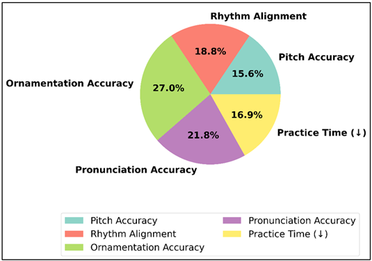 Figure 3 Comparison of Traditional vs AI-Enabled Music Learning Metrics The same trend is witnessed in terms of rhythm alignment; the 16.5% increase is an indication that the system has the power to model and strengthen complicated rhythmic patterns that would otherwise be hard to learn using standard teaching methods. Among the most significant changes is in the ornamentality accuracy which increases by 23.7. Here the efficacy of automated style recognition and culturally sensitive feedback is pointed out as the means of transmitting subtle, tradition-sensitive additions that are generally passed on orally. There are also significant improvements in pronunciation accuracy, which is also in support of the importance of cross-language vocal training using combined lyric alignment and phonetic guidance. In Figure 4, the distribution of improvements in response to key music learning performance metrics is proportional. There is also the decrease in practice time necessary to learn a task, 46.2 to 31.4 minutes, which is an indication that learning was more efficient. Students have the advantage of specific feedback which is instant and minimal in terms of repetitive trial and error. Figure 4