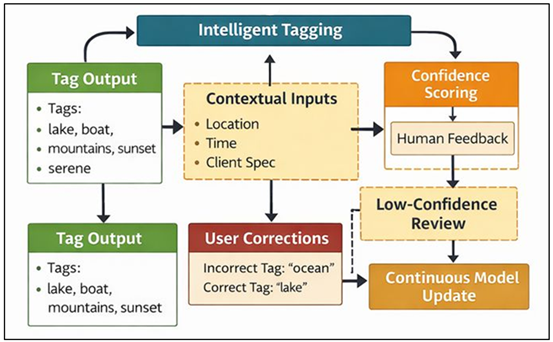 Figure 2 Intelligent Multi-Modal Tagging Framework with Human-in-the-Loop Feedback Through the use of multi-modes of learning, intelligent tagging is no longer about surface-level recognition of a tag but rather about semantics. The resulting dense and consistent tag sets are very useful in making searches more precise, less manual annotation is required, and scalable administration of large and heterogeneous collections of photographs. 5.3. Image Quality Scoring and Aesthetic Assessment Image quality rating and aesthetic evaluation is an essential part of the suggested AI structure that promotes effective curation and decision-making throughout photography processes. The quality assessment module is used to measure technical objective qualities such as sharpness, exposure balance, noise, and color, and compression artifacts. These metrics can be obtained using their pixel-level analysis and learned representation that can be effectively evaluated in a variety of capture environments and formats. In addition to technical quality, aesthetic assessment module deals with subjective areas like composition, visual balance, depth and stylistic coherence. Aesthetic models are learned using data, which are on a set of curated data, labeled by human judgment, or crowd-sourced, and the system is able to predict the human judgment of visual attractiveness. Segmentation and saliency analysis are further combined resulting in aesthetic reasoning which looks at the subject placement and the foreground-background associations. 6. Results and Analysis 6.1. Improvements in tagging accuracy and search performance The experimental test shows significant advances in tagging and search results of the proposed AI-driven framework. Automated tagging models always generated more detailed and semantically valid annotations than the rule-based and manual ones. Multi-modal learning increased recognition of complex subject matter, contextual factors and stylistic features leading to increased tag-based query precision and recall. Similarity search through embedding also improved the retrieval effectiveness by allowing the content-directed search through the huge image collections even when no explicit textual metadata is available. The users could find the relevant assets faster and less through query refinements. All in all, intelligent tagging and semantic search proved to be instrumental in enhancing discoverability, minimizing misclassification, and enhancing more interactive experience of large photographic archives. Table 2