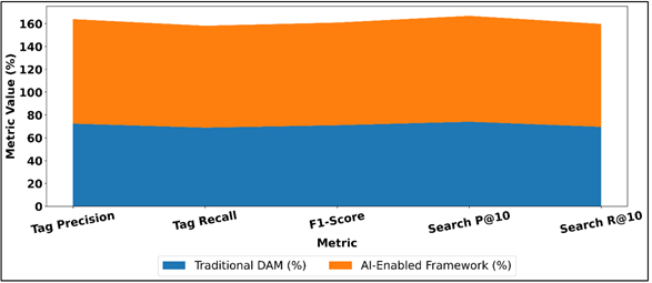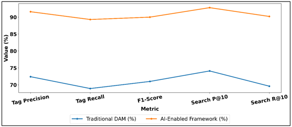 Figure 3 Comparison of Metadata Tagging and Search Performance in Traditional vs AI-Enabled DAM Likewise, the recall rate (tagging) rises at 68.9 percent to 89.3 percent indicating that a significantly bigger percentage of pertinent image features are achieved even in more intricate or diversely viewed photos. Figure 3 demonstrates that AI-powered DAM increases the accuracy of tagging and search performance by a large margin. The increased precision and recall are combined in the F1-score which increases by 0.71 to 0.90 which is a significant enhancement to the overall tagging accuracy. Figure 4 demonstrates that AI-enabled DAM is better than traditional systems in the most significant performance indicators. Figure 4