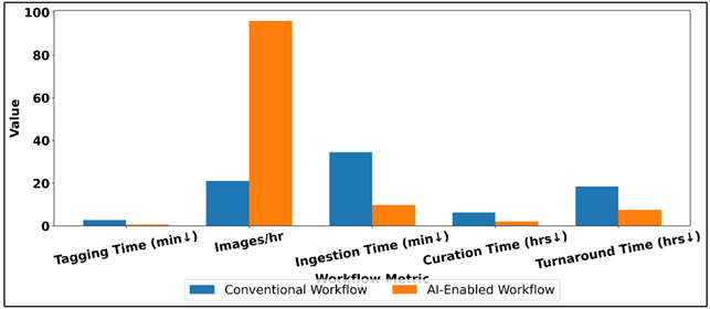 Figure 5 Comparison of Conventional vs AI-Enabled Workflow Efficiency Metrics The process of asset ingestion per batch is dropped by 34.5 minutes to 9.8 minutes, which is a manifestation of automated ingestion pipelines, format normalization, and parallel processing. Likewise, the time spent on image curation per project is reduced by half, with the new quality scoring and aesthetic rating method facilitated by AI reducing the selection and prioritization processes to 2.1 hours. As Figure 6 demonstrates, the significant improvements in workflow performance due to AI enablement are realized. Figure 6