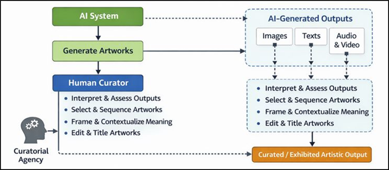 The meaning is built in a post-factum manner that is based on decisions of the curator, but not based on intentions. Figure 2 illustrates the generation of AI with human curation to direct the end artistic authorship. This makes authorship be dispersed in algorithmic process and human interpretation which undermines traditional ideas of creative ownership. The model has been especially used with large-scale generative projects, data-driven conceptual works, and installations where the volume, variation, or systemic behavior, itself, has conceptual meaning. Nonetheless, it also has a theoretical and ethical concern of responsibility, bias, and attribution because AI systems are mirrors of the structures and datasets that form their outputs. This model has the benefit of not placing AI as an alternative to human creativity, but rather as a fruitful source of conceptual provocation and critical questioning.