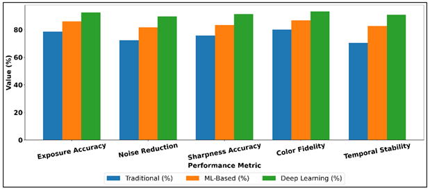Figure 3 Comparison of Camera Quality Enhancement Methods Conventional auto modes are intermediate in their performance especially in noise reduction and temporal stability, which is indicative of their dependence on intrinsic rules and parameter setting separately. Comparative performance of camera quality enhancement methods has been depicted in Figure 3. ML-based techniques exhibit significant improvements in all the metrics, which proves the benefit of learned mappings over more narrow and more frequent heuristics, in particular, accuracy of exposures and control of sharpness. The developed deep learning system scores highest in all the criteria under consideration. Accuracy of exposure is significantly enhanced and it means that adaptation is more accurate in different light situations. Figure 4