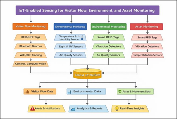 Figure 2 IoT-Enabled Sensing Architecture for Visitor Flow, Environmental Control, and Asset Monitoring in Smart Museums