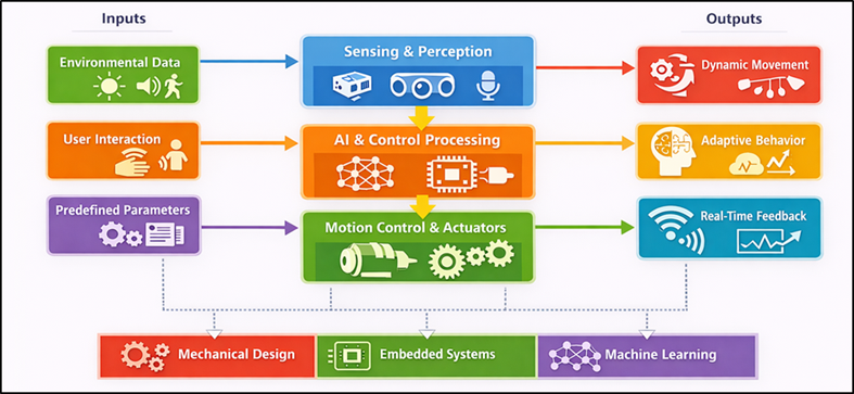 1. INTRODUCTION The autonomous kinetic sculptures mark an enormous transformation in the visual culture that includes the element of artistic expression and advanced engineering frameworks to create dynamic, responsive, and self-regulating work of art. Compared to the traditional unchanging sculpture, kinetic ones also involve movement as the primary aesthetic element and transform the space, perception, and interaction. There is the addition of autonomy, and this is through embedded computation, which causes the sculpture to be an intelligent artifact that can respond to the stimulus in the environment and the interaction of the human being without the need to be controlled by human beings always. This convergence theorizes the greater technological shifts in contemporary society in which artificial intelligence, robotics and cyber-physical systems are shaped by technology with more frequency on cultural productions and experienced design Gorb et al. (2025). The historical roots of kinetic sculpture lie in the experiment of the avant-garde of the first part of the twentieth century. Naum Gabo and Laszlo Moholy-Nagy were artists, who explored the marvels of movement, light and mechanical constructions as part of art. The first sculptural practice followed the invention of suspended mobiles by Alexander Calder later on where the organic movement occurred due to air currents and balance. These extreme magazines sabotaged the idea of permanence and of materiality in stasis and placed movement as a language of form to the fore. This paradigm was further extended by subsequent twentieth century cyberscientific art developments that also involved feedback loops and interactive systems into the production of art Su (2019). However, today, with the emergence of microcontrollers, sensors, and machine learning algorithms, sculptures can move and even feel, make a decision, and develop. Autonomous kinetic sculptures fit in the strange interdisciplinary fringe in the world of the modern visual culture. The built in system illustrated in Figure 1 allows intelligent motion and adaptive expression. They synthesize the principles of mechanical design such as a kinematic analysis, dynamics analysis and structural analysis with embedded systems engineering and computation intelligence Song et al. (2022). The expressive physical movement of programmed logic is done through the action of actuators, servo motors, the stepper motors, and pneumatic mechanisms. Figure 1 |