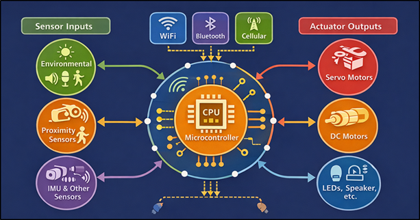 Autonomous kinetic sculptures are controlled by embedded systems which have the computational intelligence. A microcontroller forms the central processing unit which engages sensor inputs, decision-making algorithms and actuator outputs in real time. The popular ones are Arduino and Raspberry Pi, since they are versatile, inexpensive, and can be integrated with a wide variety of peripherals. These architectures usually incorporate digital input/output pins and analog-to-digital converters and pulse-width modulation (PWM) channels as well as communication protocols like I2C, SPI and UART.