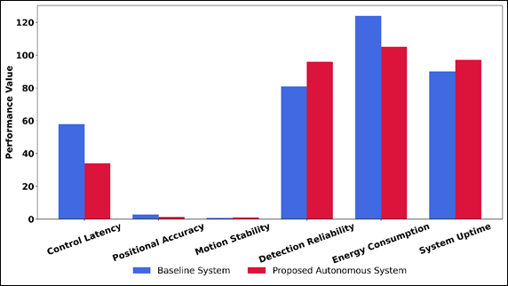 This reduction enables the real time interaction and further well-orchestrated movement performance. There was also a rise in the level of positional accuracy, reduction of deviation to about ±1.2 o instead of a maximum of 2.8, and an improvement in motion control and fluidity of the aesthetics. The index of motion stability increased to 0.89 as compared to 0.72 and it indicates that the vibration control and conventional mechanical functioning were enhanced. Figure 5 shows that system metrics are distributed in terms of performance improvement. The sensor senses recognition rate rose to 96 percent compared to 81 percent that signified a decent multi- sensor feedback and enhanced feel of the surroundings.