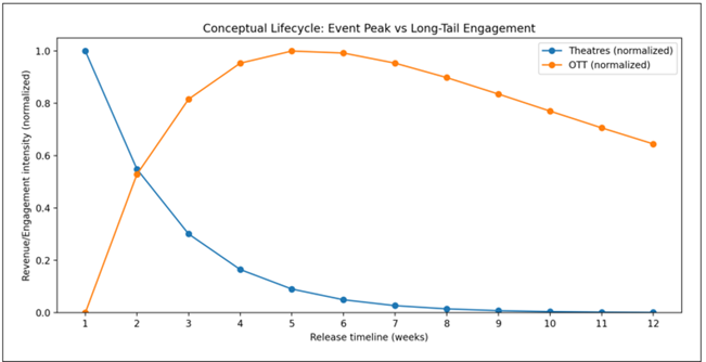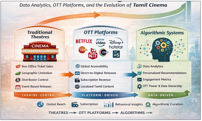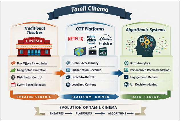 Figure 2 Evolution of Tamil Cinema 3.1. The Era of Theatrical Dominance Theatrical exercise served as the foundation of the economic system of the Tamil cinema over several decades. Primary income generators were single-screen theatres in Tamil Nadu and adjacent state with box-office performance being the deciding factor on the commercial validity of a given film. Occupancy rates, ticket sales, and length of theatrical run (so-called 100-day or silver jubilee milestones) were used as measures of success. The distribution was by region based circuits, and rights were sold by territory. Producers avoided financial risk through pre-selling distribution rights, satellite rights and overseas rights. 3.2. Star System and Box Office Economics The star system had become the staple of the theatrical Tamil cinema. Actors such as Rajinikanth, Vijay and Ajith Kumar had very large fan base that could impact on opening day collections. Star-driven economics has been employed in pre-release hype, teaser launches and festivals scheduling. This mechanism is known by the academic commentaries as risk concentration, and big-budget films rely on the influence of stars to ensure the attendance in the theaters. To project the revenue, actor market value and historic market trend of performance and distributor trust were used instead of the information on the granular audience. 3.3. Multiplex Expansion and Urban Audience Shift The growth of multiplex theatres in major cities like Chennai, Coimbatore and Madurai happened in the early 2000s. Multiplexes brought about differentiated pricing, better infrastructure and targeting the audience. It was during this time that the content started to diversify slowly with urban-inspired content and experimentation which attracted niche viewers. The multiplex model changed the way of revenue distribution; it focused on premium pricing and reduced theatrical windows. It also enabled multi-screen releases which increased the amount of revenue that could be made on opening weekend. Nevertheless, even with modernization, the model relied on physical attendance and geographic reach and did not penetrate the countryside and could not be extended to overseas markets. 3.4. Pandemic Acceleration and Direct-to-Digital Releases The Covid-19 pandemic was an act of structural disruption. As the theatres continued to stay closed, a number of the Tamil movies chose direct-to-OTT releases on services like Netflix and Amazon Prime Video. In contrast to theatrical releases, OTTs assessed content on the basis of numbers of subscribers, usage rates, and retention over time as opposed to opening weekend grosses. Film-makers enjoyed a head start in selling the rights digitally, avoiding the box-office unpredictability. Such a step represented a change of concept: the measurements of success were no longer considered in terms of ticket sales but watch time, completion rate, and engagement analytics. 3.5. Emergence of Hybrid Release Models Recovery in the wake of the pandemic brought about hybrid releases, which is the mixture of theatrical releases and the reduced length of the OTT releases. Blockbuster movies were embracing staggered release: theatrical release and then digital release in 4-8 weeks. This redistribution risk was distributed by this hybridization. Theatric releases maintained the experience and spikes of revenue of the mass event, whereas OTT releases guaranteed the prolongation of the cycles of monetization and access to the global audience. Simultaneous accessibility was obtained by the diaspora audiences thus eliminating reliance on foreign theatrical circuits. In terms of industrial aspect, Tamil cinema transformed to be geographically bound but theatre-reliant into platform-integrated and data mediated ecosystem. The decision-making parameter was moved away from the distributors and exhibitors, and on streaming platforms with predictive analytical capabilities and algorithmic curation. 4. OTT Platforms and