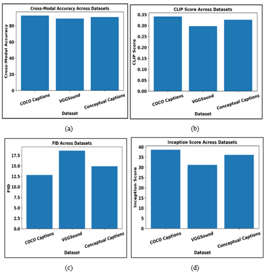 comparison (c) FID across datasets (d) Inception Score across datasets In the Figure 4, a comparative analysis of multi-modal generative performance on three benchmark datasets, namely, COCO Captions, VGGSound, and Conceptual Captions, is made by four main criteria, namely, Cross-Modal Accuracy, CLIP Score, Fréchet Inception Distance (FID) and Inception Score (IS). The Figure 4 (a) demonstrates cross-modal accuracy, in which COCO Captions has the highest value, which implies high semantic consistency between generated outputs and conditioning modalities, whereas Conceptual Captions comes next, which implies strong performance of generalization of large-scale web data; the value of VGGSound is slightly lower because of the difficulty of aligning audio and visual streams. In the Figure 4 (b), similar scores of CLIP are reported, with higher scores of text image alignment on COCO Captions, where Conceptual Captions showed similarity scores in a competitive manner even though the annotations were noisier, and VGGSound had a lower score due to cross-modal heterogeneity. Figure 4 (c) shows the FID results, the principle of which is the lower the FID, the higher the visual realism, COCO Captions has the lowest FID, which confirms the high-quality image synthesis, VGGSound has higher FID values, which evidences the more difficult task of audio-visual generation, and Conceptual Captions demonstrates rather moderate performance across the various content. Inception Scores in Figure 4(d) show that diversity and quality of generated samples are favored, with COCO Captions then Conceptual Captions and VGGSound showing lower scores because of the complicated temporal and acoustic variations of the generated examples. Taken together, the number illustrates a pattern of similar stability in how metrics perform, which proves that the proposed framework is efficient in balancing the generative fidelity, semantic alignment, and diversity based on heterogeneous datasets. The findings also suggest that the attributes of datasets have a significant impact on the performance, and curated vision-language datasets have better scores, and audio-visual benchmarks add further complexity. Comprehensively, the number confirms the strength and generalization ability of the suggested multi-modal generative methodology in different benchmark conditions. 5.2. Computational Efficiency Analysis Table 4 indicates the calculational benefits of the proposed framework over a base multi-modal generator. The training time gets lowered by 39.6 hours to 58 hours and this represents an improvement by 39.6% which greatly shortens the model development and experimentation time. Table 4