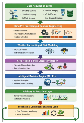 1. INTRODUCTION There are emerging interdependent risks in agriculture due to the variability in climate, extreme weather and changes in agro-ecology. Weather-crop interactions have been at the forefront in the determination of crop growth, pest interactions, disease outbreaks, and yield stability and therefore sustainable food production requires proper forecasting and action before the situation worsens Hernández et al. (2025). Conventional decision making in crop protection has been based mostly on past averages, expert lead policies or reactive management policies that tend to be insufficient in face of a swiftly shifting climatic regime Arumugam et al. (2021). The increasing access to high-resolution weather information, remote sensing, and observations of farms has led to the creation of intelligent, data-driven models that can explain the dynamic relationship between weather and crops, as well as precision agriculture Iqbal et al. (2024). However, with these developments the weathercrop interactions are still very difficult to model because of the uncertainty in climate, nonlinear crop behavior and delayed feedback of management intervention. The interaction between weather variables (rainfall, temperature, humidity and wind) is complex and stochastic, and crop stress responses are likely to have threshold effects, time lags and cumulative effects during the growth stages Baio et al. (2023). Scheduling irrigation, pesticides or delayed treatment may lack short-term results, which complicates the optimization of the short horizon and puts more pressure on having to settle on a suboptimal choice Teodoro et al. (2021). Such difficulties require long-term reasoning model that is able to take into account uncertainty in future weather scenarios. Figure 1 |