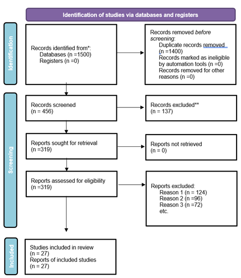 3.4. Screening and Selection Process The database search initially identified 1,500 records across the selected electronic databases. After the removal of 1,044 duplicate records, 456 unique records remained for screening. Title and abstract screening resulted in the exclusion of 137 records, leaving 319 reports for full-text retrieval and eligibility assessment. Following full-text review, 292 reports were excluded for not meeting the inclusion criteria, and 27 studies were ultimately retained for inclusion in the final synthesis (see Figure 1). The final corpus comprised 11 quantitative or quasi-experimental studies, 7 qualitative investigations, 3 mixed-methods studies, and 6 systematic or conceptual reviews. Collectively, these studies demonstrated thematic saturation and represented diverse higher education and ESL/EFL contexts across Asia, the Middle East, Europe, and Africa, thereby supporting the robustness and international relevance of the review. Figure 1