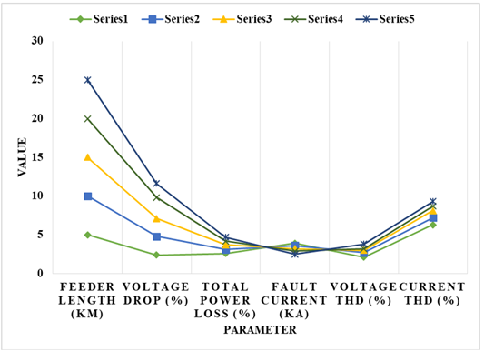The moderating distance dependence of total power loss is also caused by conductor resistance and earth return impedance. The amount of harmonic distortion is much lower than the IEEE 519 limits, which means that the topology of the simplified conductor performs well in terms of power quality. The Fault current magnitudes are also similar to the traditional distribution systems, which proves that the standard protection devices like circuit breaker and reclosers can work successfully within the proposed architecture. Figure 2 shows how electrical performance parameters such as the feeder length, voltage drop, power loss, fault current and harmonic distortion vary. The findings indicate system behavior in varying operating conditions and prove manageable voltage deviations, acceptable power loss and stable fault current. Figure